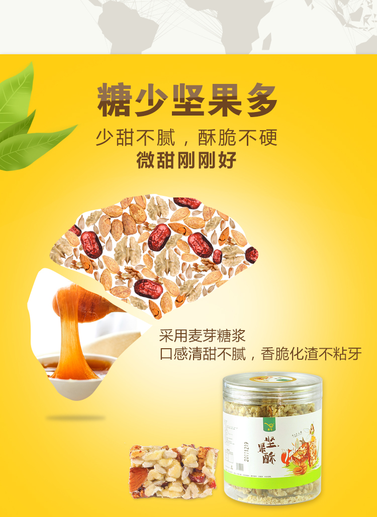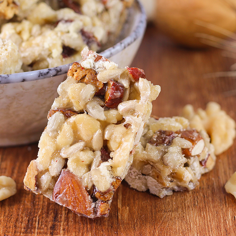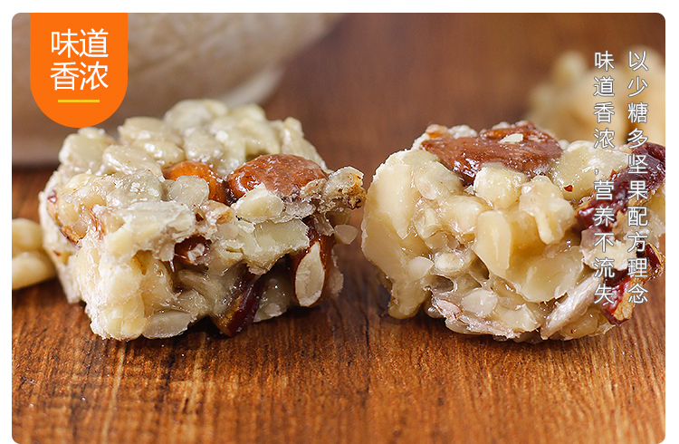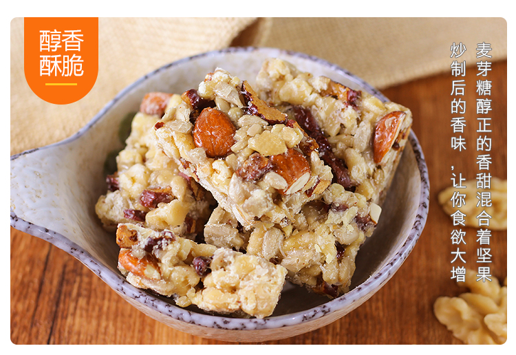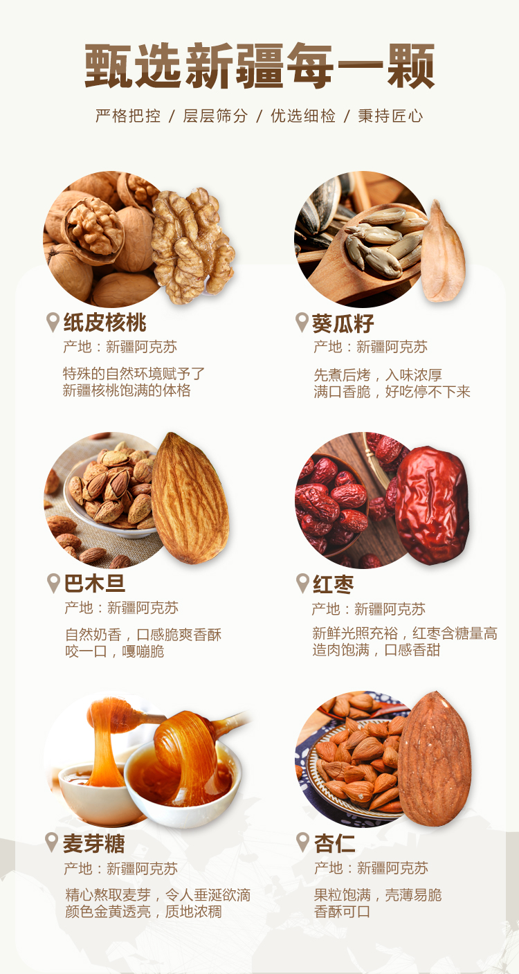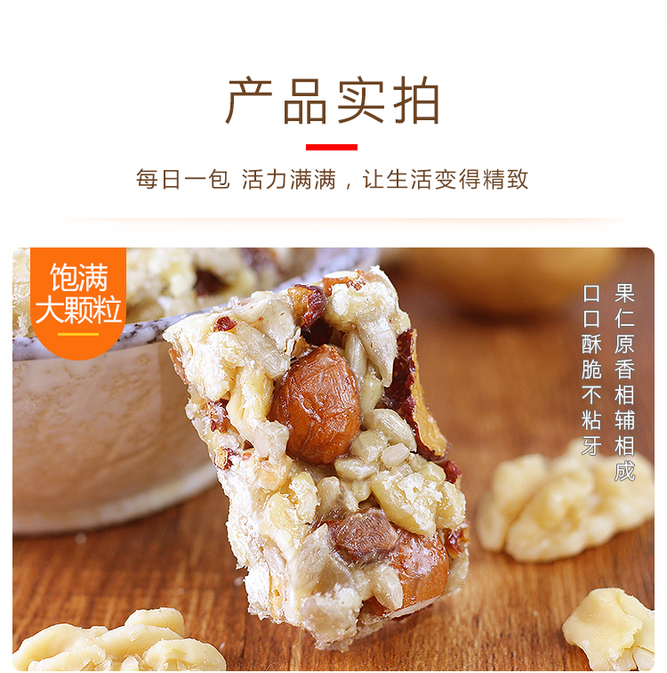 配料表: 核桃仁、葵花籽仁、杏仁、巴旦木、紅棗片、麥芽糖、白糖、食用植物油、食用鹽、蜂蜜